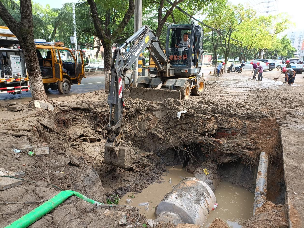 在搶修現(xiàn)場(chǎng)看到,公司副經(jīng)理曾國(guó)剛、運(yùn)維部部長(zhǎng)劉要華正在組織工作人員設(shè)置路障,指揮挖掘機(jī)開挖路面、清理淤泥。2輛搶修車停在路邊,保障后勤需要,10余名工作人員正在分工明確地投入到緊張的搶修中。