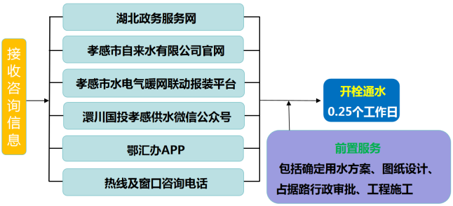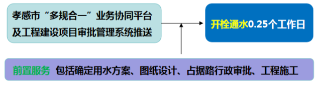 流程說明:供水企業(yè)通過孝感市“多規(guī)合一”業(yè)務(wù)協(xié)同平臺及工程建設(shè)項(xiàng)目審批管理系統(tǒng)推送獲取項(xiàng)目建設(shè)信息后主動對接,先行開展確定用水方案、圖紙?jiān)O(shè)計(jì)、工程施工等服務(wù),辦理用水工程涉及的占道、掘路、占用綠地、伐移樹木等相關(guān)行政審批手續(xù),提前完成外線工程實(shí)施,為客戶提供“無感免申請”服務(wù)。客戶需要用水時(shí),0.25個(gè)工作日內(nèi)開栓通水。