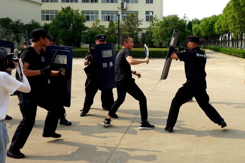 接警后,孝南公安分局巡邏大隊、治安大隊和南大派出所組織了16名警察和特勤隊員荷槍實彈趕到現場,并在現場指揮員的果斷指揮下迅速完成外圍監守布防和內線包圍突進,不到一分鐘就奪下兇器,干凈利落地將“暴恐分子”制服收押。