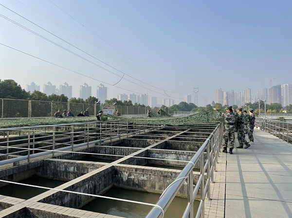 上午9點30分,21名民兵著訓練服在隊長王冠群的口令下整隊稍息,隨后跑步前往三水廠絮凝池,對水池進行防空襲前的偽裝防護。除此次預演之外,11月10日,公司應急搶險搶修專業隊在三水廠供水泵房還進行了空襲后設備受損的快速搶修演練。